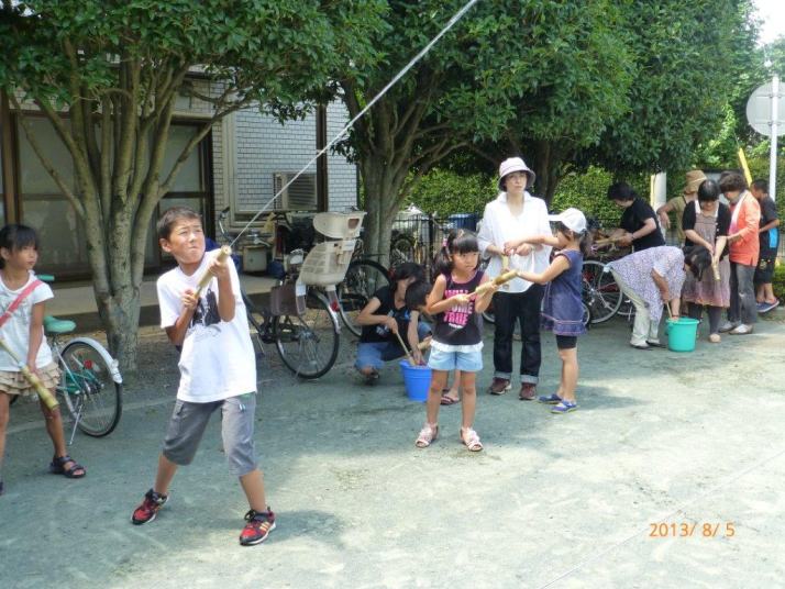 H25年8月5日(月)、上友会館で環境まちづくりNPOエコメッセ、および、 水・緑・木地昭島の主催による「水鉄砲の製作」を行い、あきしまおもちゃ 病院も協力しました。 竹筒が真円でないためにピストンとのはめ合せに 苦戦していたようですが、水が勢いよくでる様になると喜んでいました。 17日(土)に昭島駅の南口に作った水鉄砲を持ち寄り打ち水を行いました。 ・・画像をクリックすれば拡大します・・