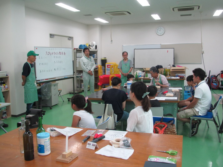 H26年8月23日(土)、ゴミ減量の一環として、環境コミュニケーション センターの主催で「LEDワインボトルスタンドの製作」を行い、 総勢12名の子ども達と保護者が参加してくれました。 木製の台にカットしたワインの空き瓶を載せ、内部からLEDで照らし、 好きなシールを貼って世界に一つのスタンドを作りました。 当日の製作の様子を紹介します。 ・・・画像をクリックすれば拡大します・・